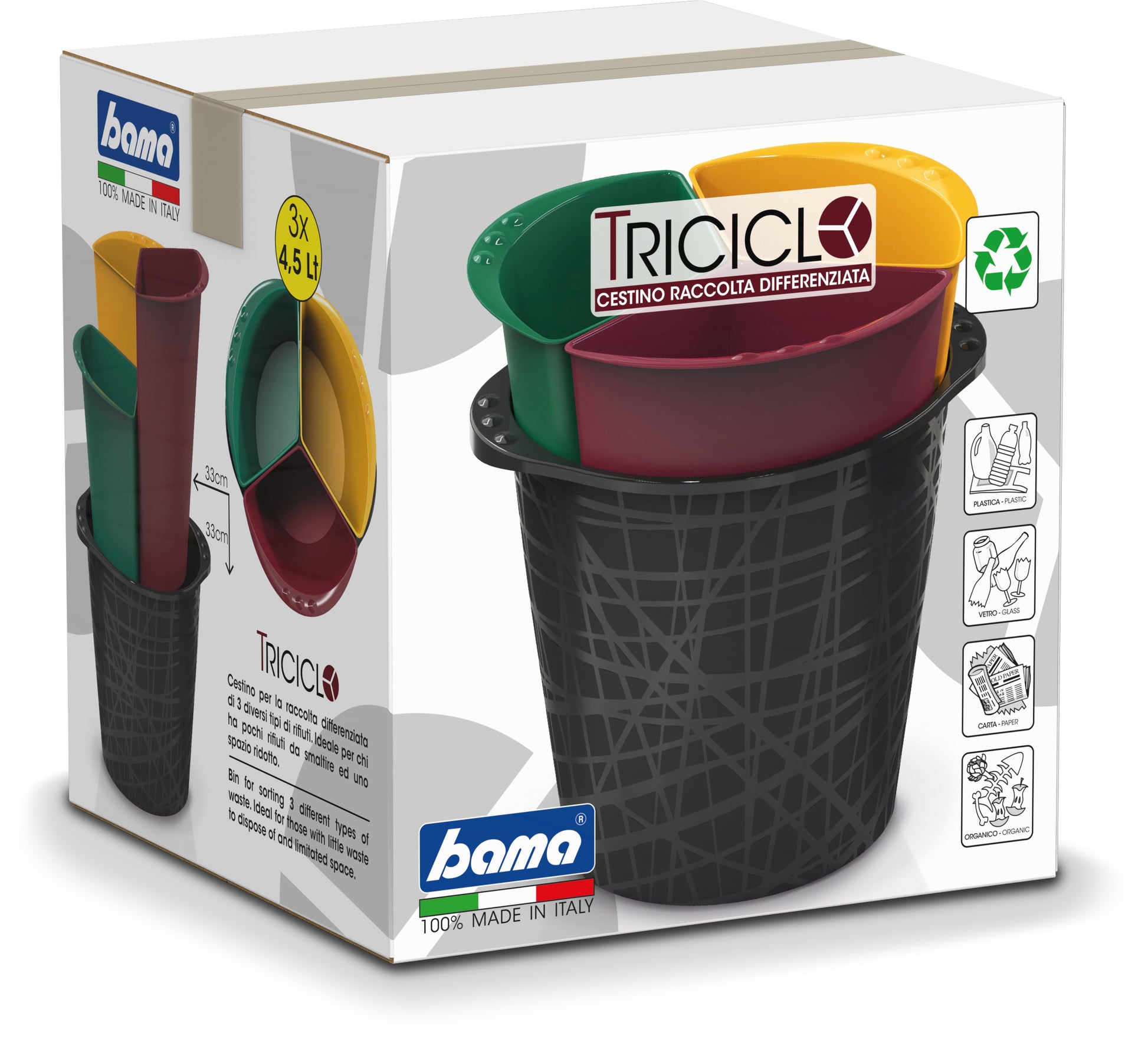 Afval scheiden? Dat doe je makkelijk én overzichtelijk met de Bama Triciclo! Deze compacte prullenbak met 3 gekleurde compartimenten van elk 4,5 liter is perfect voor wie bewust wil leven, zonder in te leveren op gemak of design.