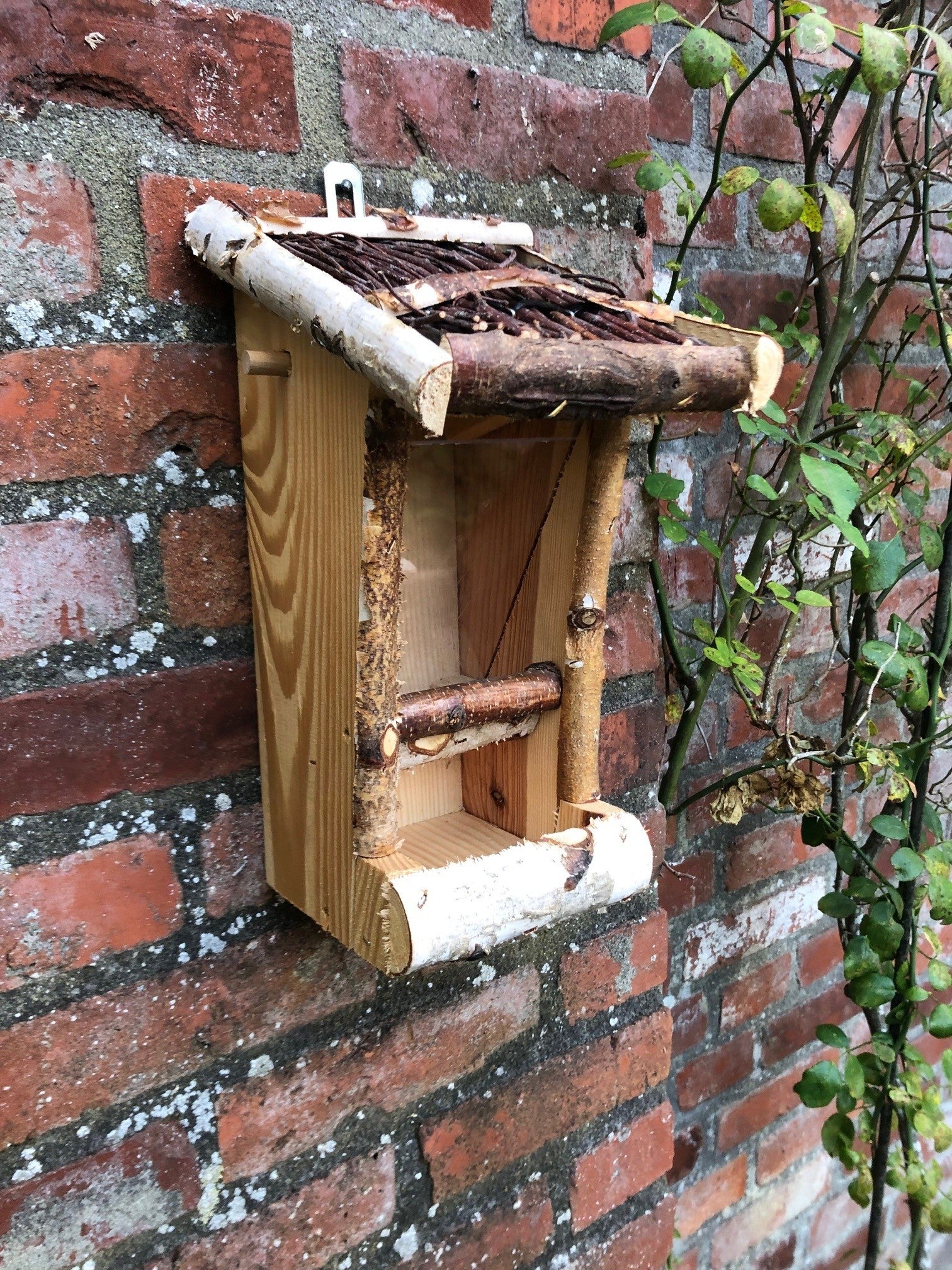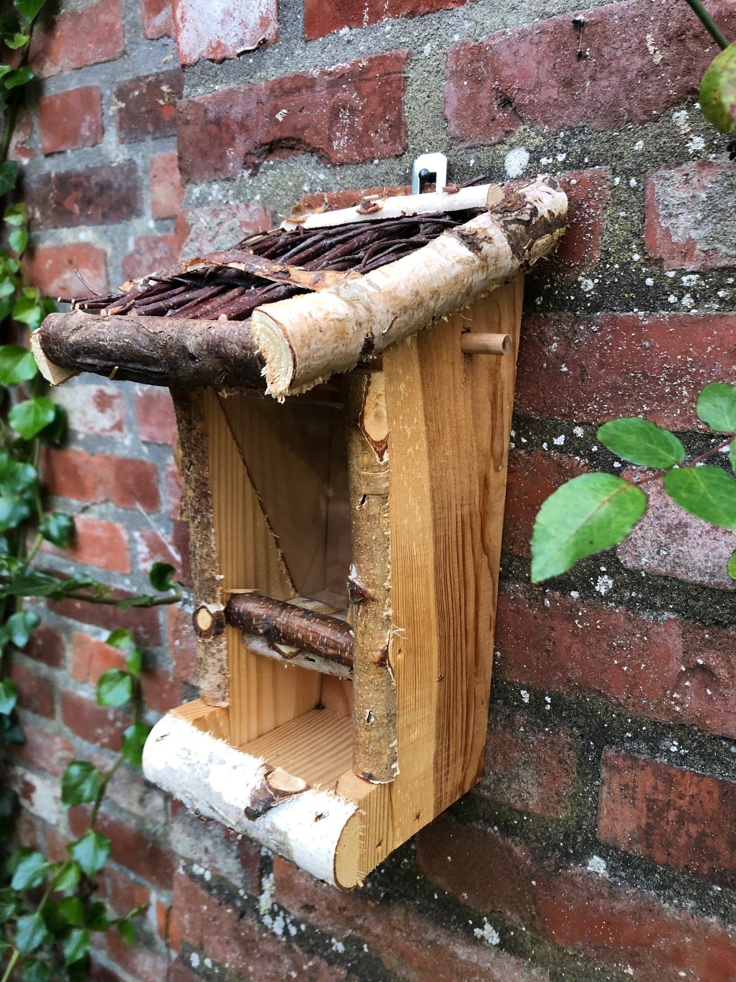 Dutchlander - Vogelvoedersilo – Muurbevestiging – Berkenhout met Wilgen Dak – Plexiglas Venster – 15x19x30 cm