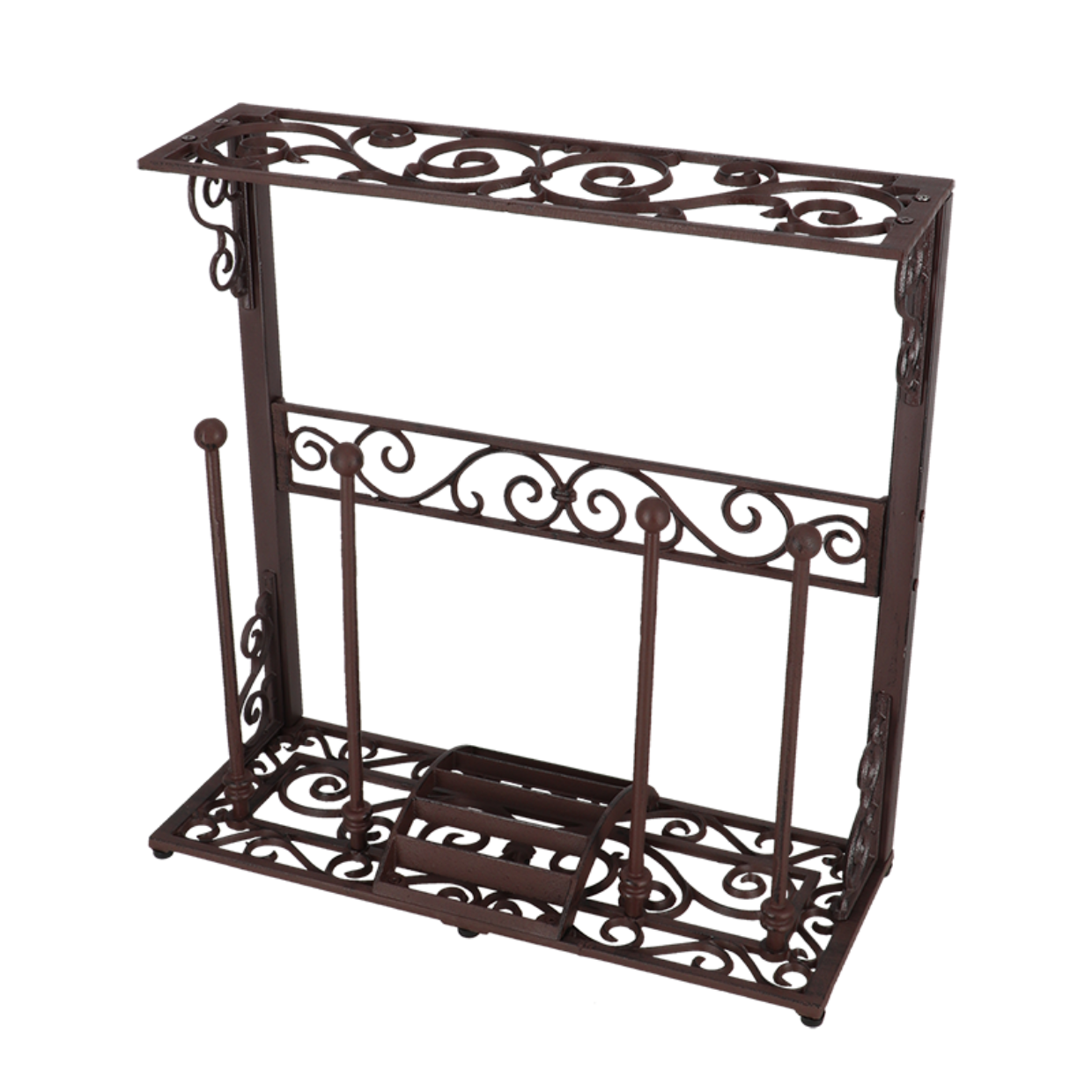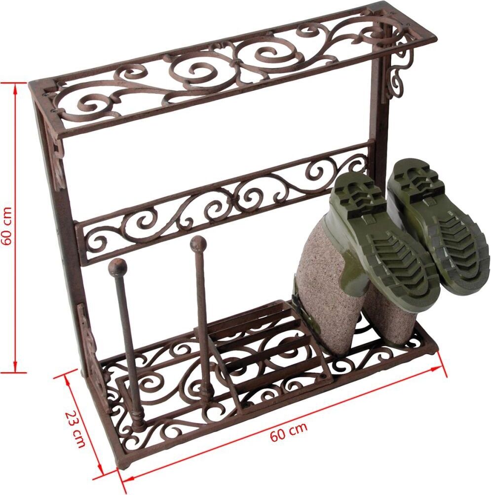 Het gietijzeren laarzenrek is robuust en duurzaam. Het heeft een retro ontwerp met sierlijke, decoratieve patronen. Voordat u de laarzen in het rek zet, kunt u de zolen schoonmaken op de handige modderschraper. De schoenorganizer biedt plaats aan 2 paar laarzen.