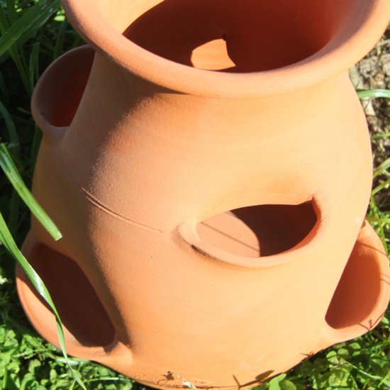 Kweek eenvoudig je eigen verse aardbeien met deze Franse handgemaakte terracotta aardbeien kweekpot. De pot is ontworpen om meerdere aardbeienplanten tegelijk te laten groeien in één compacte plantpot. Dankzij de openingen rondom krijgen de planten voldoende licht en ruimte, terwijl de wortels goed beschermd blijven.