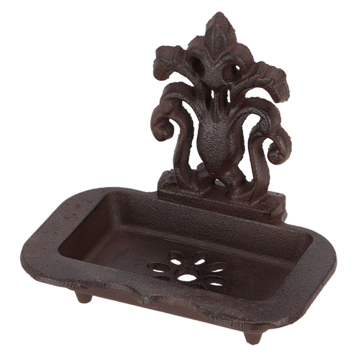 Een roestbruin gietijzeren zeepbakje die neergezet kan worden. Onder het bakje zitten pootjes, zodat het stabiel staat. In het bakje zitten afwateringsgaatjes. Afmeting: 16 x 11,5 x 14 cm.