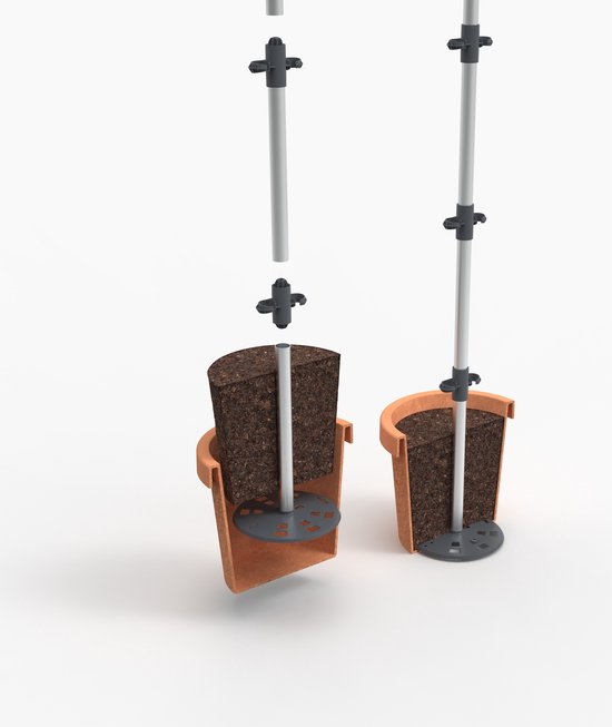 Je bent het beu met vallende tomaten klimsteunen? Dan zit je hier helemaal goed! TOMATO BUDDY is een stabiele klimsteun en vult elke gangbare plantenbak aan. Onze klimsteun wordt voor het planten in de pot geplaatst en wordt dus gestabiliseerd door het gewicht van de grond. Het enige wat nodig is, is een plantenbak met een diameter onderaan van minstens 20 cm.