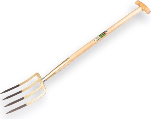 Spitvork met 4 platte tanden. Merk vork OFFNER, kleur brons. Tand breedte 1,5 cm, lengte 27 cm. Compleet met 90cm Essen T-steel. Steelverbinding: stift-verbus. Spitten met een spitvork heeft twee voordelen t.o.v. een spade. Eerste voordeel is dat bij het verpoten van een plant of struik de wortels worden gespaart en niet worden afgestoken. Tweede voordeel is dat grond, veen of klei minder snel aan het blad kleeft. Spitvorken zijn in vele varianten leverbaar en worden ook gebruikt voor het rooien van aardappels of ander pootgoed en het omzetten van compost.