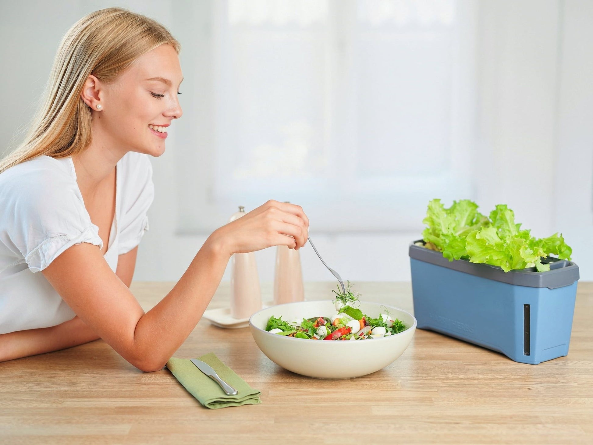 Het geïntegreerde bewateringssysteem met waterreservoir en bewateringslinten zorgt ervoor dat jouw kruiden en microgroenten altijd van de juiste hoeveelheid water worden voorzien. Een venster aan de zijkant van de pot laat zien wanneer het tijd is om water toe te voegen.