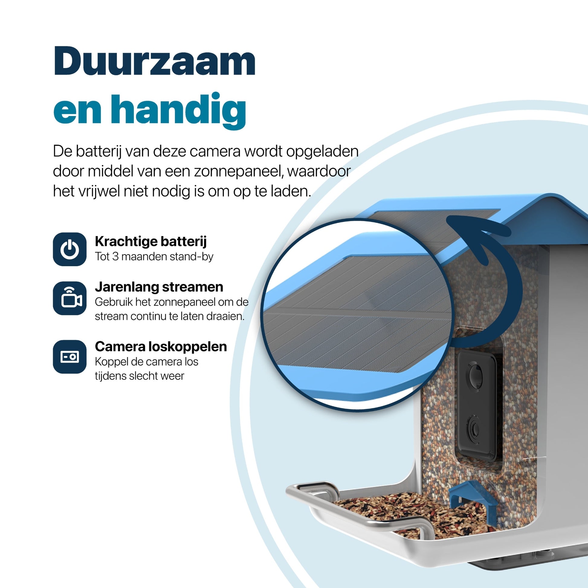 Het BOME Vogelvoederhuisje met Camera is ook uitgerust met hoogwaardige functies zoals een snelle beeldoverdracht via wifi, zodat je de beelden live kunt bekijken op je smartphone, tablet of computer. Het heeft een robuust en weerbestendig ontwerp dat bestand is tegen alle weerselementen, waardoor het duurzaam is en langdurig gebruik in verschillende weersomstandigheden mogelijk maakt. De camera wordt continu opgeladen door het ingebouwde zonnepaneel. Dit maakt het apparaat duurzaam en bovendien prettig in gebruik. Opladen is namelijk zelden nodig!